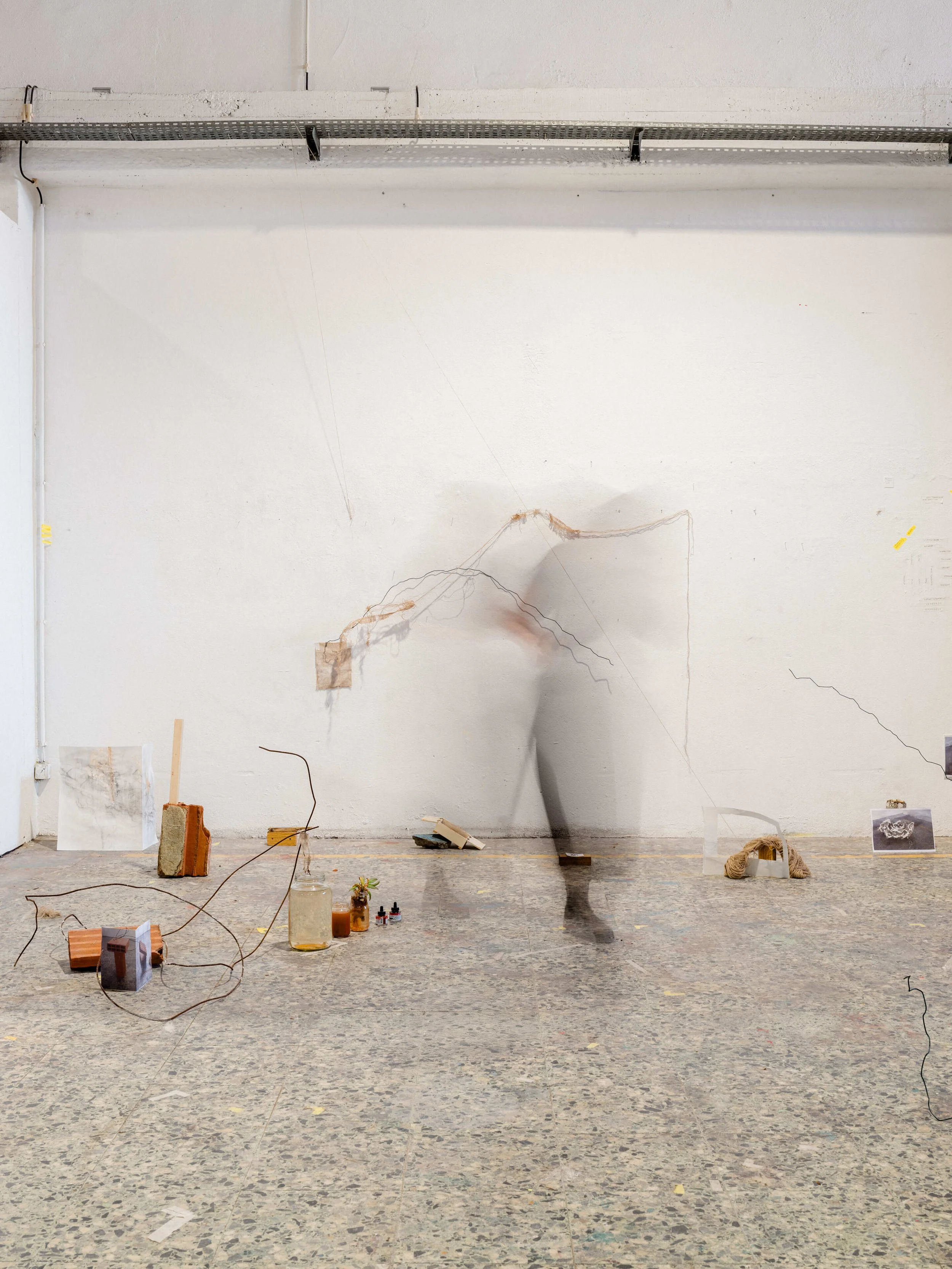Echoes of Interaction, June 2025, body, jute, dust of jute, found wires, found box, ink, water, iron, unmade fens, found bricks, core samples, wood, rust, ink and charcoal on paper, acrylic paint on photographs, tape, dimensions variable, Pada Studios, Barreiro, Portugal. Photograph: Ricardo Gonçalves